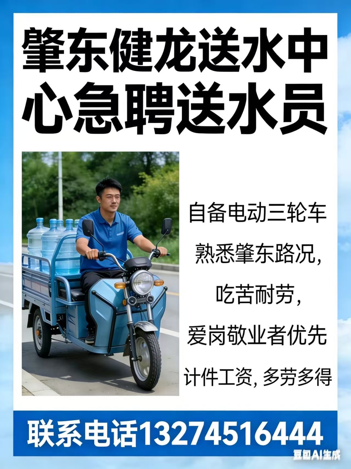 自備電動三輪車。熟悉肇東路況,每桶3.5元,工資每年都上調,計件工資,多勞多得。