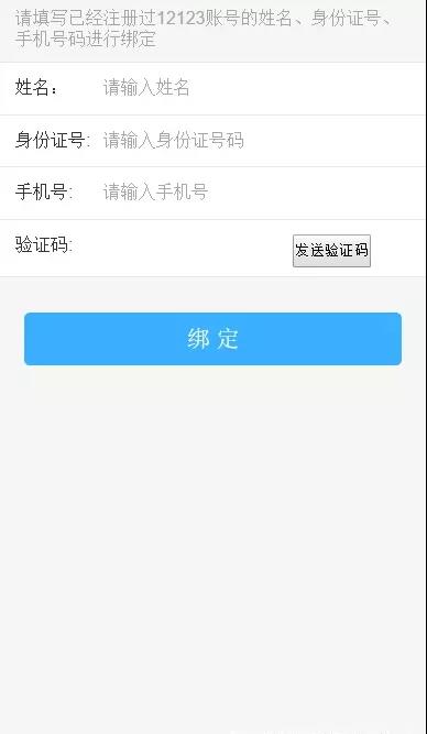 如沒有綁定直接跳轉到綁定頁面,輸入相關信息進行綁定即可,沒有12123用戶直接注冊。