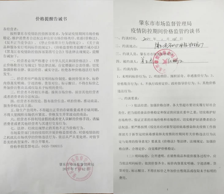 同時,對全市9個大中型超市負責人進行約談,并在《價格監(jiān)管約談書》上簽字。各基層分局監(jiān)管人員分別深入轄區(qū)經(jīng)營商戶,發(fā)放《價格提醒告誡書》2200余份,宣傳疫情防控知識和價格管理相關(guān)的法律法規(guī),要求各市場主體遵紀守法,自覺維護市場秩序,為全市抗擊疫情貢獻自身力量。