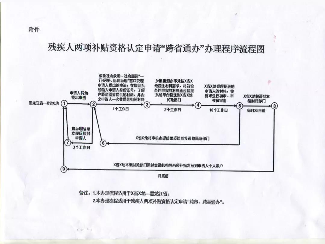 二、規范補貼資格認定申請“跨省通辦”程序各鄉(鎮)、街道辦事處要按照異地代收代辦方式,統一使用全國殘疾人兩項補貼信息系統(以下簡稱全國系統)受理殘疾人兩項補貼資格認定“跨省通辦”申請。受理地要一次性告知申請人所需要提供的材料,及時將相關證明材料等申請信息錄入全國系統,并在申請材料收齊之日起3個工作日內推送至業務屬地(即申請人戶籍所在地)的補貼受理窗口;業務屬地為申請人遠程辦理,自收到推送材料之日起10個工作日內完成補貼資格認定,辦理結果將由全國系統實時反饋受理地;受理地應在收到辦理結果3個工作日內,將辦理結果以適當方式通知申請人。享受補貼政策的類型及標準由業務屬地負責解釋。補貼資格審定合格的,自遞交申請當月由業務屬地計發補貼。