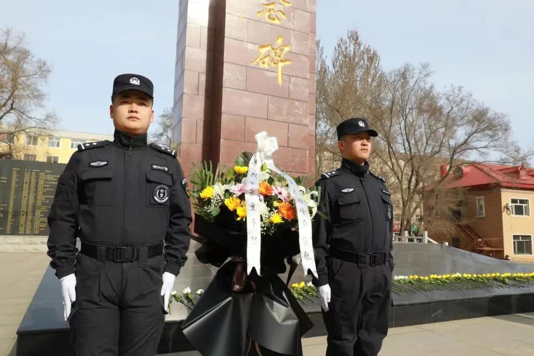 參加祭奠活動的全體民輔警懷著濃濃的哀思和崇高的敬意,整齊列隊,來到英雄紀念碑前向英烈紀念碑敬獻了花圈和鮮花,全體民輔警肅立默哀,表達對英雄們無限的崇敬和深切的緬懷之情。