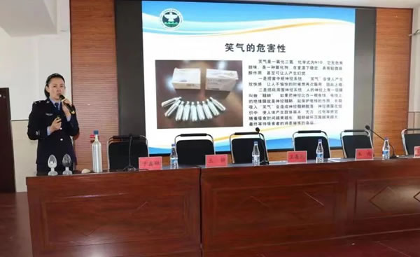 活動(dòng)中,禁毒工作人員利用PPT課間,用通俗易懂的語言,帶領(lǐng)學(xué)生們了解了佐匹克隆、氫溴酸右美沙芬片、復(fù)方曲馬多等精神藥品知識(shí),講解了新興毒品的危害,發(fā)放了新興毒品知識(shí)宣傳資料,展示了仿真毒品模型,并與學(xué)生們進(jìn)行了知識(shí)問答互動(dòng),加深學(xué)生們對(duì)禁毒知識(shí)的了解。如何遠(yuǎn)離毒品、青少年吸食毒品的誘因分析等知識(shí),構(gòu)筑起拒毒心理防線。同時(shí)民警提醒師生們要清醒認(rèn)識(shí)吸食“笑氣”的危害性,自覺抵制并做到不好奇、不嘗試、不濫用。