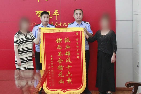 7月12日,“2007.10.16”特大搶劫殺人案被害人家屬,來到肇東市公安局將一面印有“鐵血雄風十六載,鍥而不舍擒元兇”的錦旗送給辦案民警,以表達感激之情。