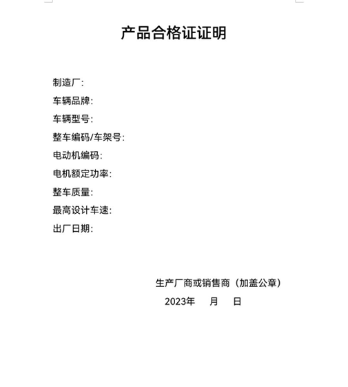 1、電動(dòng)車合格證