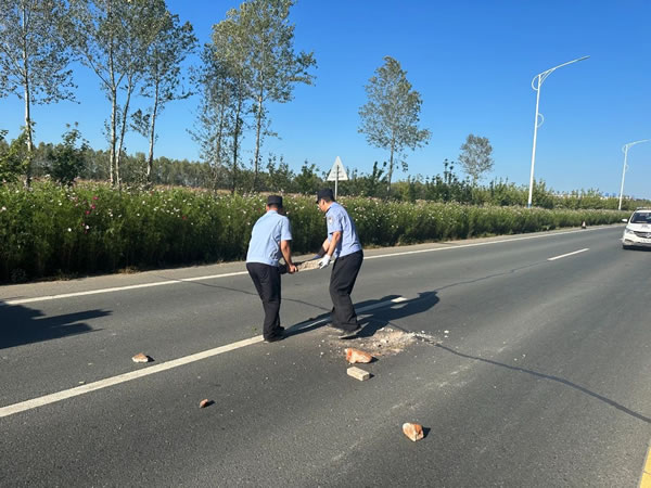 9月2日15時,肇東鎮派出所在轄區環南環路八道街至五岔路口巡邏時發現路面有過往運輸殘土車輛遺落的混凝土磚塊等殘土,存在嚴重道路交通隱患, 容易引發道路交通事故,嚴重影響過往車輛正常通行和駕駛人員安全。派出所巡邏民輔警第一時間設立交通反光錐,緩行指示牌,在提醒過往車輛注意行車安全減速慢行的同時,及時清理遺落的殘土,確保道路行車安全,受到過往群眾一致好評。