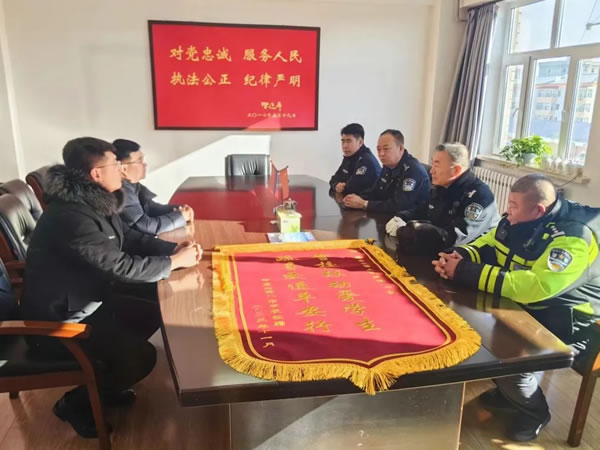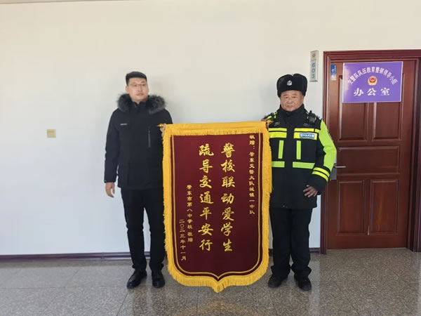 11月13日,肇東市第八中學校長王慶和副校長王大偉來到交警大隊,將一面印有“警校聯動愛學生,疏導交通平安行”的錦旗送到交警大隊城鎮一中隊,代表全校師生由衷感謝城鎮一中隊“護學崗”執勤人員情系師生出行安全,維護校園周邊道路交通秩序,保障全校師生上下學期間交通安全、有序、暢通。
