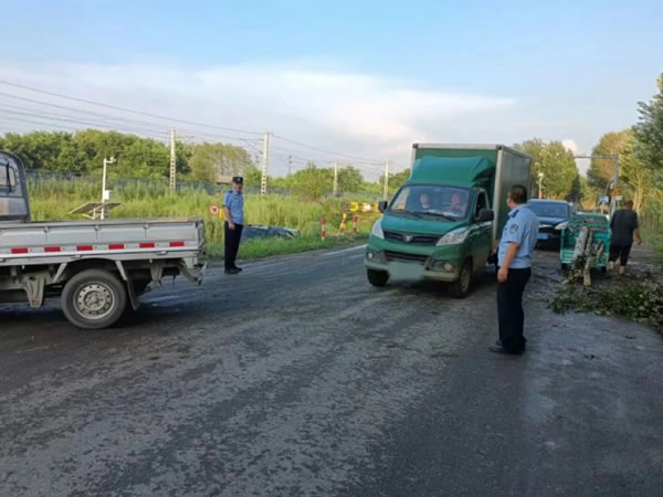 2024年7月23日下午,肇宋路上因大風導致路邊大樹橫倒,嚴重影響了交通流暢,存在安全隱患。接到好心人報警后,輔警孫超、王立濤迅速趕到現場,并立即向所長劉景會匯報了情況。所長劉景會迅速作出反應,與尚家村領導取得聯系,并迅速組織人員前往現場實施救助。在村民和尚家派出所民警的共同努力下,大家齊心協力,成功將橫在路上的大樹移開,及時恢復了道路暢通,確保了過往車輛的安全通行。