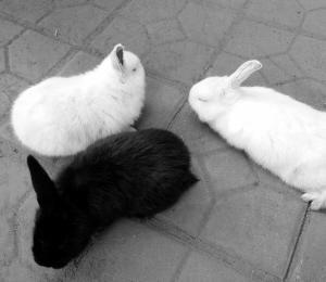 去年3月份蔡先生買回來5只小家兔,平時(shí)除了喂食白菜、蘿卜,工人吃剩的飯菜不論葷素都會倒進(jìn)兔子食盆。去年冬天一只母兔懷孕,不久前產(chǎn)下3只幼崽,竟然全部只有一只右耳。