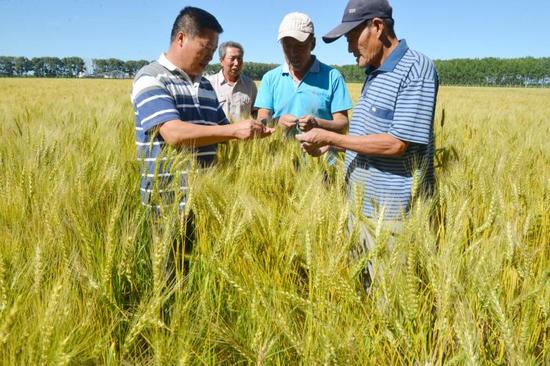 近日,肇東市黎明鎮長富村千畝有機小麥金黃色的麥浪隨風飄擺,再過十余天就將成熟收割。據了解,長富村依托谷物合作社、農機合作社以及糧食深加工企業帶動村民共同致富,實現了農民與企業合作“雙贏”。圖為村干部與農民一起查看小麥長勢。