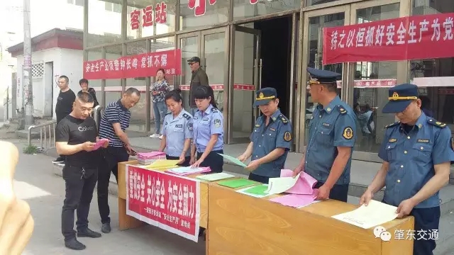 6月16日上午,按照交通運輸局黨委認(rèn)真落實市委、市政府“安全生產(chǎn)月”和“安全生產(chǎn)龍江行”活動的工作部署,交通運輸局安全辦組織市公路管理處、道路運輸管理站、交通公安執(zhí)勤室三家執(zhí)法單位聯(lián)合開展“6-16”安全日宣傳活動。本次活動共出動執(zhí)法宣傳車6臺,執(zhí)法人員19人,在市區(qū)重點部位、人員密集場所、公交車上等懸掛安全標(biāo)語共52條,在市客運總站門前設(shè)立宣傳臺一處,發(fā)放宣傳單1370份。