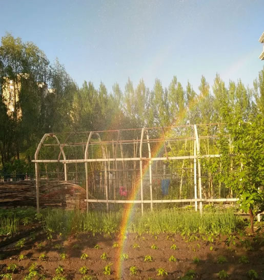 滕立坤是菜園主人,退休后以侍弄樓前5分小菜園為樂趣。由于連日高溫干旱,5月30日6時許,他在自家水井上按泵通電,將水管連接起噴頭綁在竹竿子上,在菜園子的上空高高豎起,開始噴水澆園抗旱,出乎預料的是在陽光的照射下,水霧中驚奇般的出現了一道亮麗的風景線。我趕緊用手機記錄下了那精彩的瞬間,吸引了數十名晨練的人們駐足觀看。