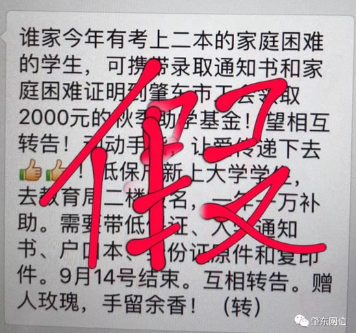 近日,一則內(nèi)容為“誰家今年有考上二本的家庭困難的學(xué)生,可攜帶錄取通知書和家庭困難證明到市工會領(lǐng)取2000元的秋季助學(xué)基金”的消息在微信朋友圈和群聊中頻頻傳播,并引發(fā)關(guān)注。