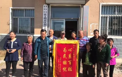 2018年9月26日,肇東市東升區辦事處化工社區四網格的社區居民們把一面寫著“心系百姓為民排憂”的錦旗送到了東升區化工社區書記謝廣忠的手中,對社區居委會幫助解決該居民區排水問題表示衷心的感謝。