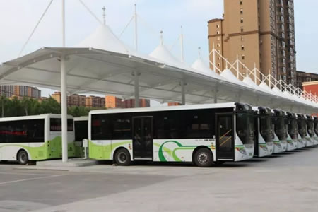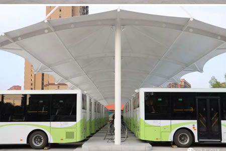 充電站整體建筑,2018年“一期工程”充電棚采用陽光板鋼結構,而今年的“二期工程”充電棚建設采用更加先進的張拉膜結構,大部分由鋼材、索和膜構成,造型美觀,兼具透光、節能、環保,優良的阻燃性,防污自潔性為一體,最重要的是安全、可靠、壽命長。
